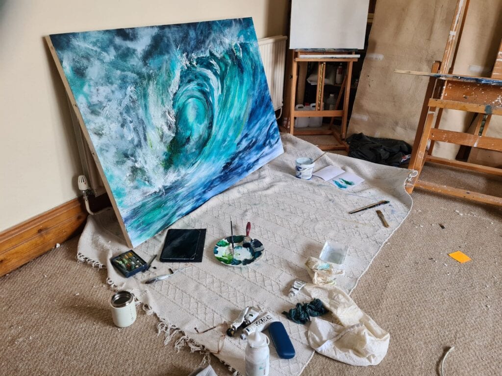 Jo Frost is particularly known for her depictions of the energy and vitality of the ocean as well as Large open Gower Bays. Mixed media and resin are her chosen mediums. After a career teaching art in Secondary Education and colleges Jo works as a full time professional Fine Artist. Jo has a studio in Mumbles, and welcomes enquiries relating to Commissions as well as exhibiting and selling in galleries.