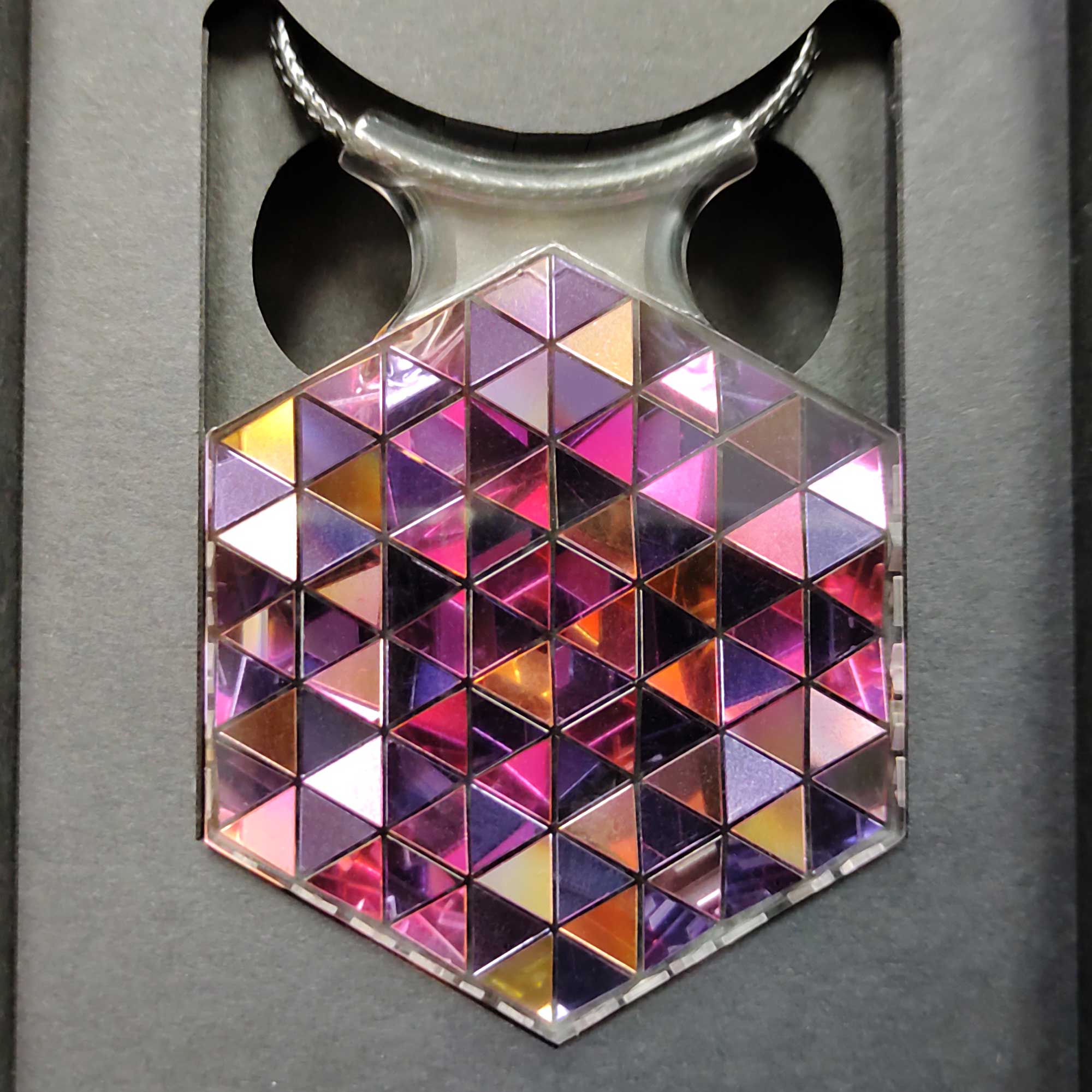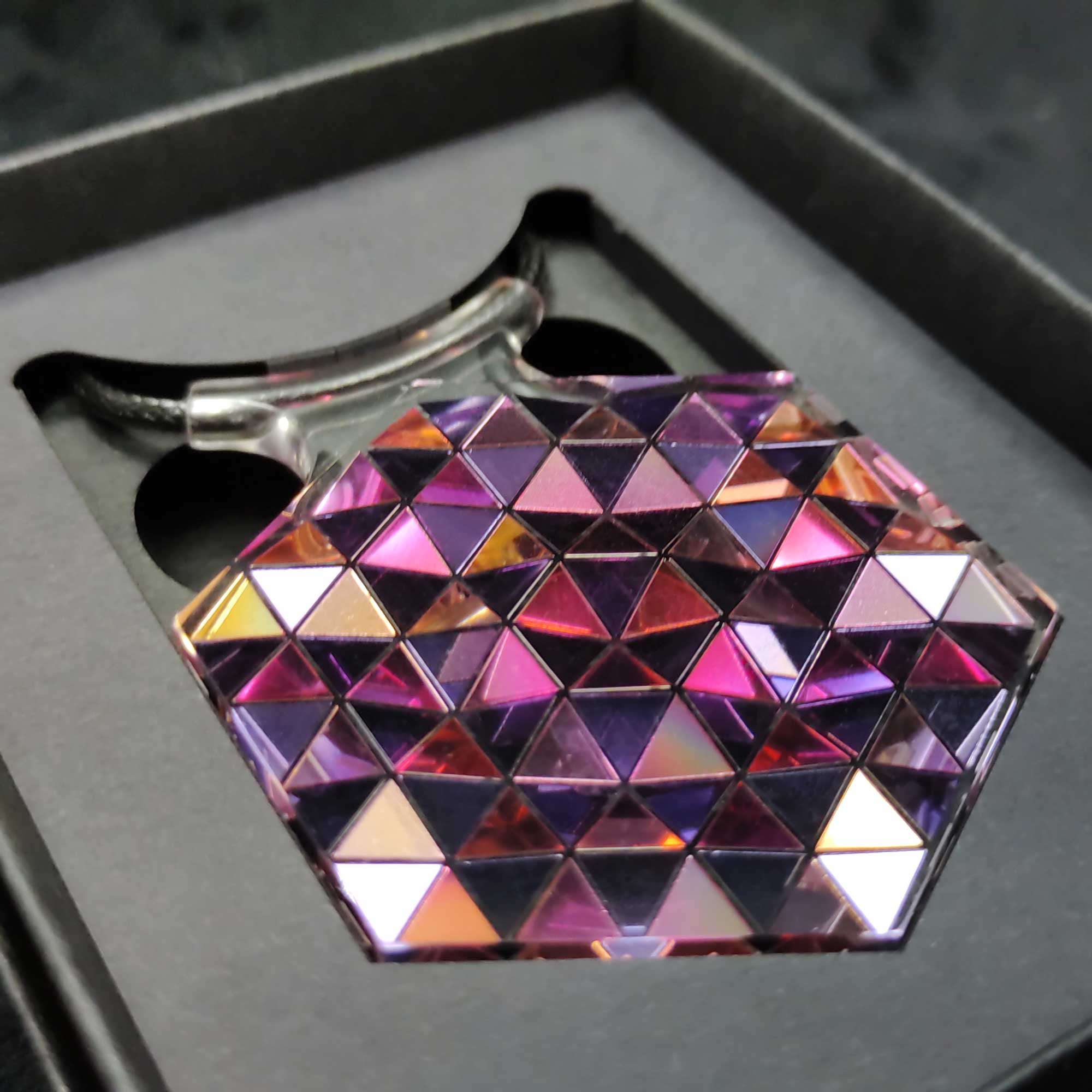 Resin casting with gold-purple sequin film. In laser-cut presentation box
