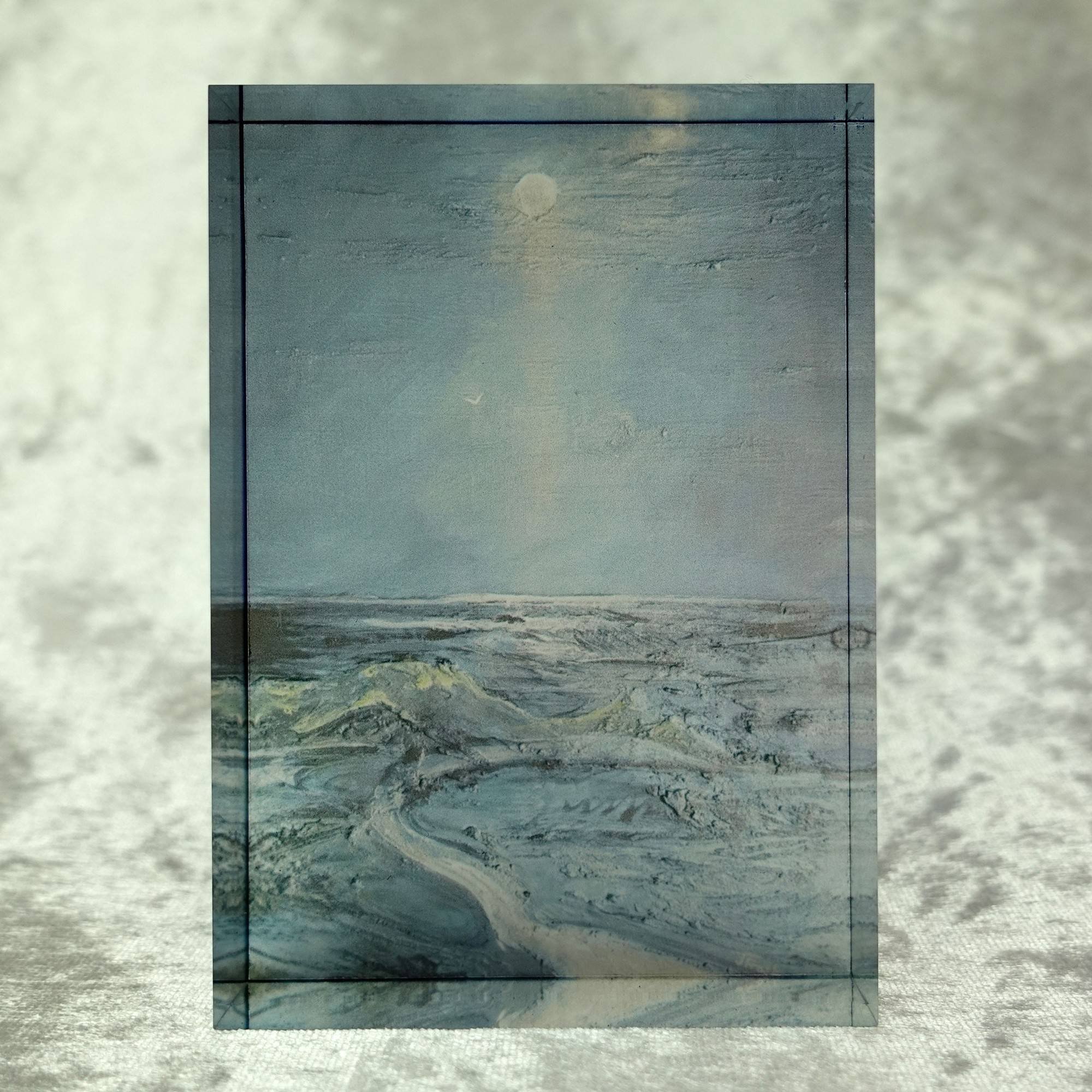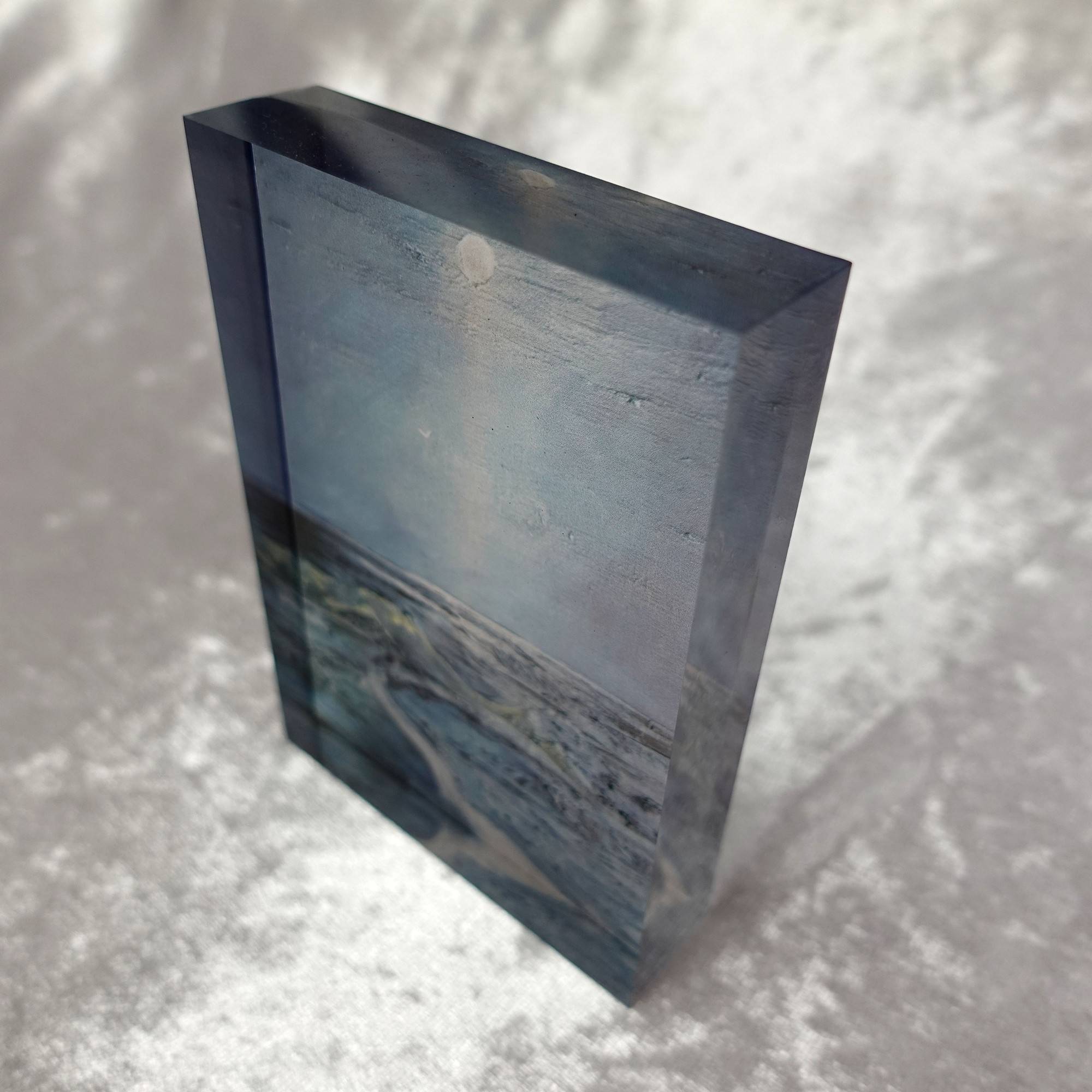 Photographic reproduction on acrylic block.