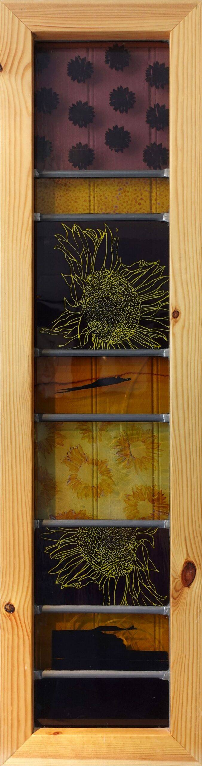 These lead panels are based on the idea surrounding Eco Therapy which helped the artist cope with covid lockdowns. Her reading of Deborah Cracknell’s ‘By the Sea’ confirmed her belief that the sea has a unique, positive effect on a person’s wellbeing.