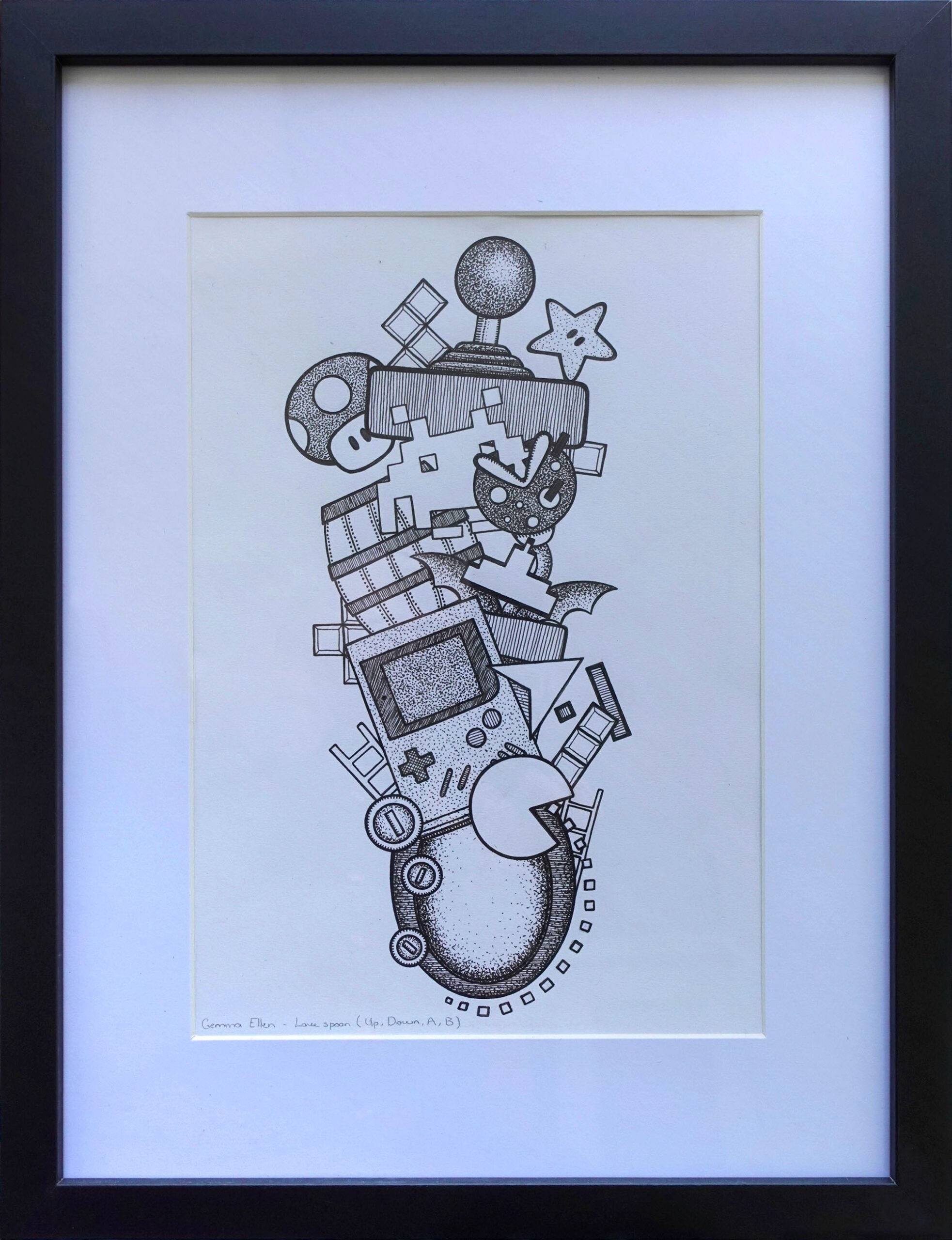 Ink on paper. Framed and glazed