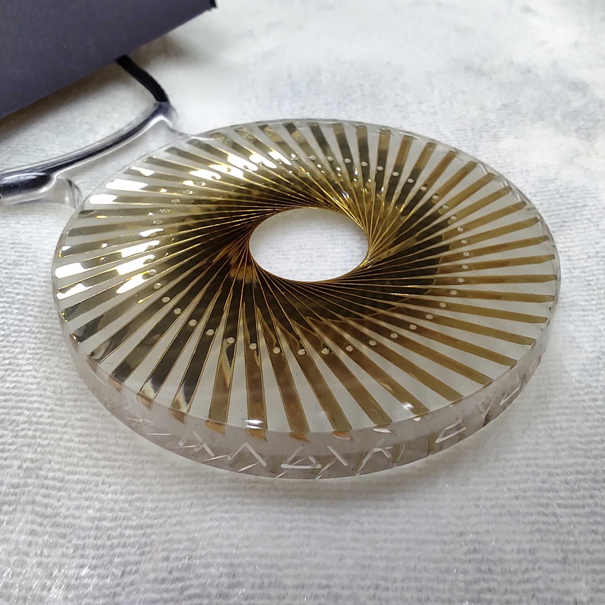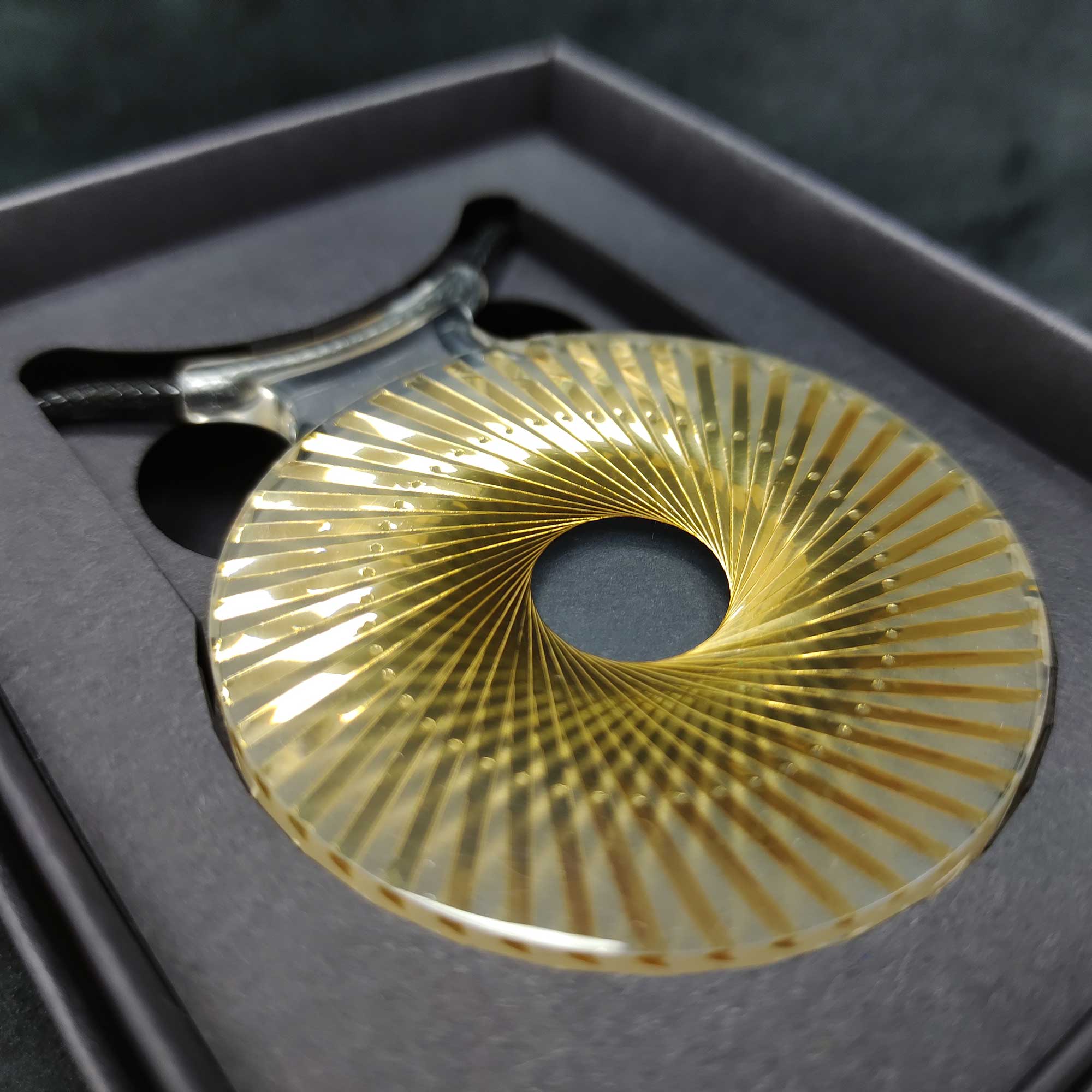 Resin casting with gold/silver film through a glass bead diffusion layer. In laser-cut presentation box